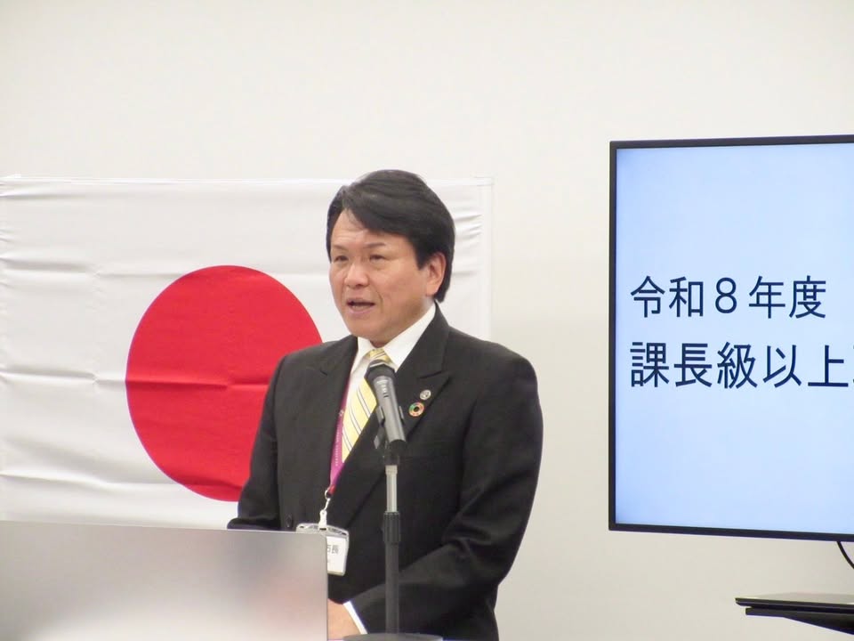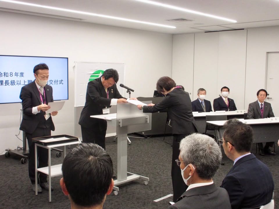 異動した部長級を含み、昇進した課長級以上の職員に辞令交付。よろしくお願いします。