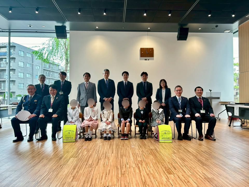 贈呈式では、代表児童へ、 #黄色いワッペン と #トラック型防犯ブザー も同時に贈呈。企業、団体の皆様、ありがとうございました。