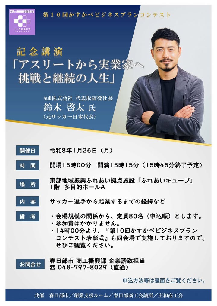 #かすかべビジネスプランコンテスト #表彰式 を開催。最優秀賞2グループに発表いただきました。ご受賞された皆様おめでとうございます。(写真参照) 続いて、第10回記念事業として、AuB(株)代表取締役#元サッカー日本代表 #Jリーガー #鈴木啓太 氏の講演会には、多くの聴衆が集いました。 実体験に基づいた話は、わかりやすく、参加された皆さんも満足そうでした。私も参考にさせていただきます。貴重なご講演ありがとうございました。 #春日部市長 #いわや一弘 #かすかべプラスワン